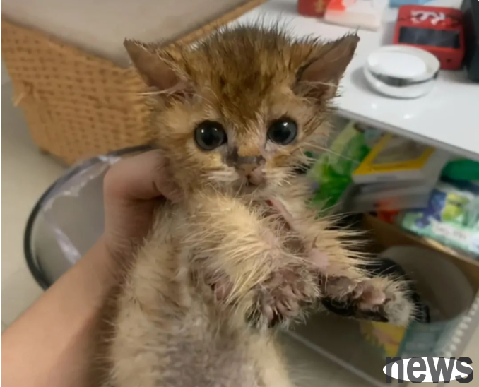 On his way home from get off work one day, a netizen found a small orange stray cat huddled behind a trash can on the roadside. It looked to be only about 2 months old. The little guy was dirty and a little wet. Many of the hairs on his body had fallen off. He was probably infected with a skin disease.