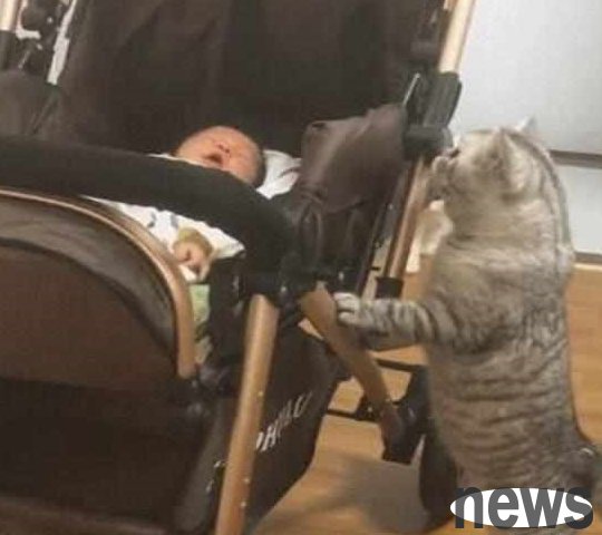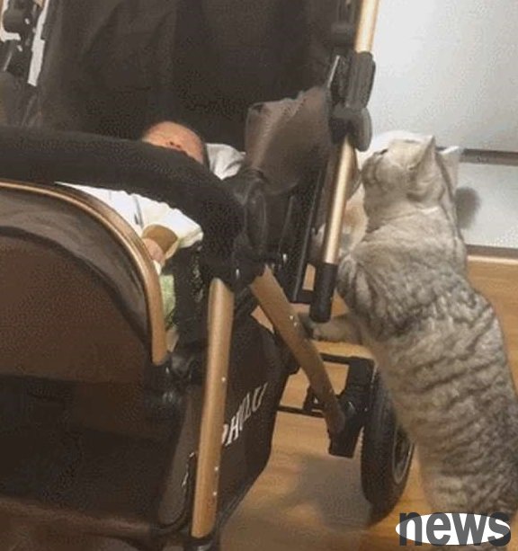 But it was not tall enough, so it could only look in through the gap in the cradle. Seeing the little master crying constantly, the big fat cat was so anxious that he could jump into the cradle and hug the little master in his arms and coax it! But because its height is not enough, it can only be rushed around in a hurry.