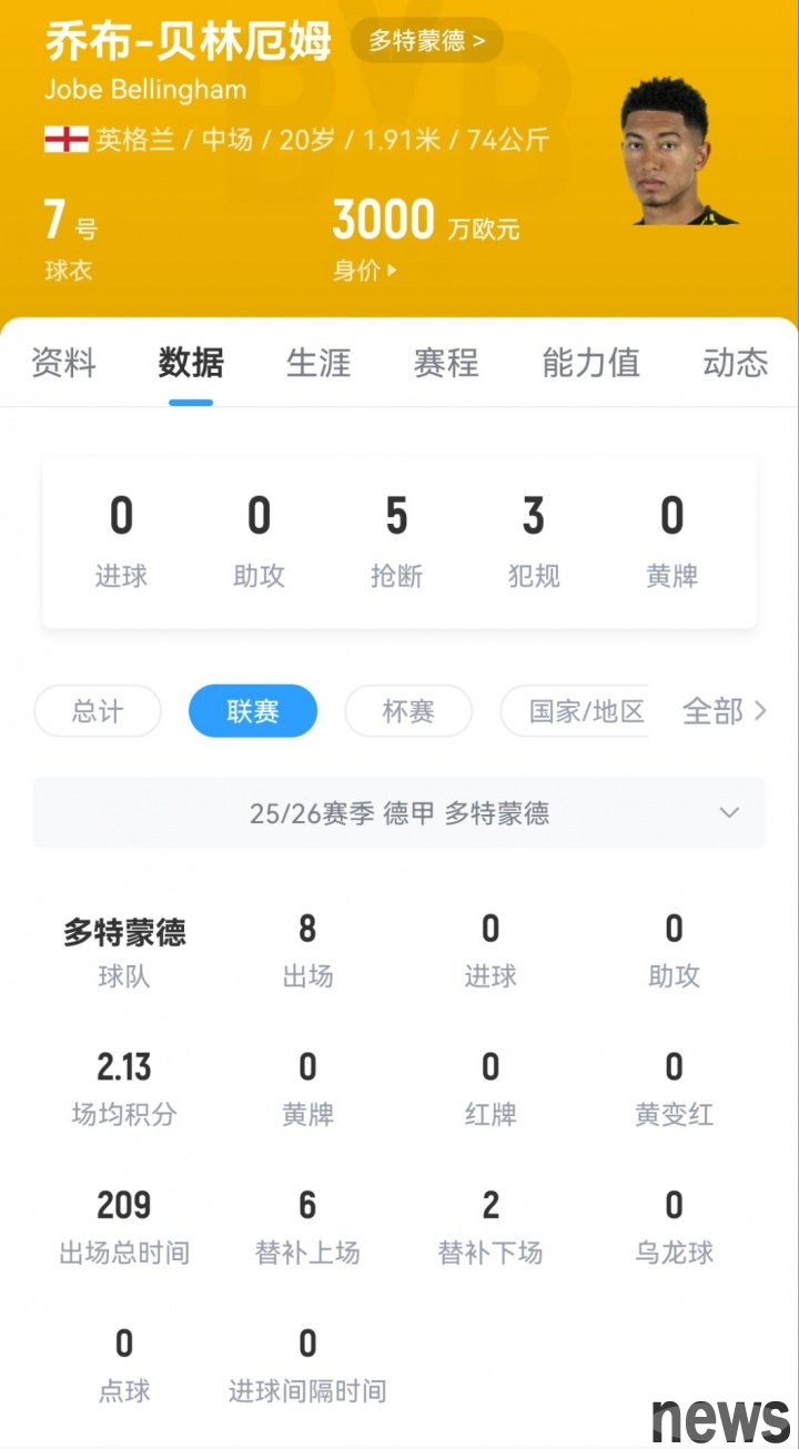 The 20-year-old Bellingham has played 8 games for Dortmund in the Bundesliga this season. He has no league goals or assists and only contributed 2 assists in the last Champions League game against Copenhagen. His current transfer price in Germany is 30 million euros.