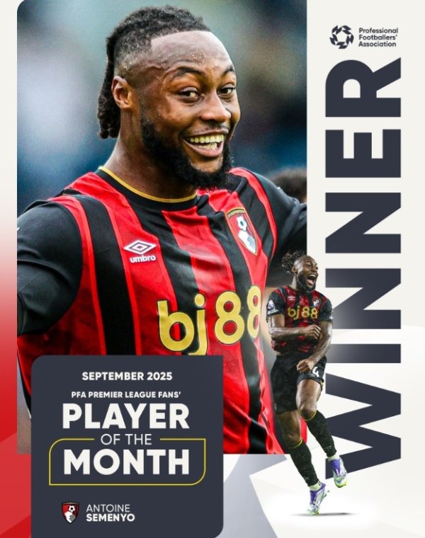 The PFA (Professional Footballers ' Association) officially announced that Bournemouth winger Semenho was voted the Premier League Player of the Month in September by fans. In the past month, Semenho played in 3 Premier League games, scoring two...