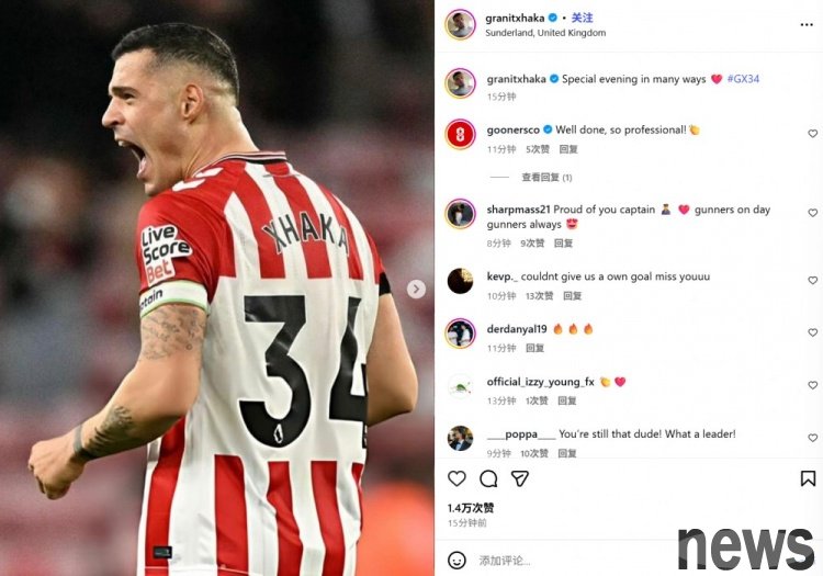 The newly promoted Sunderland tied Arsenal 2-2 at home in this round of Premier League's highlight match. Captain Xhaka performed well in the starting game. He made 7 clearances in this game. After the game, he posted a photo of himself roaring...