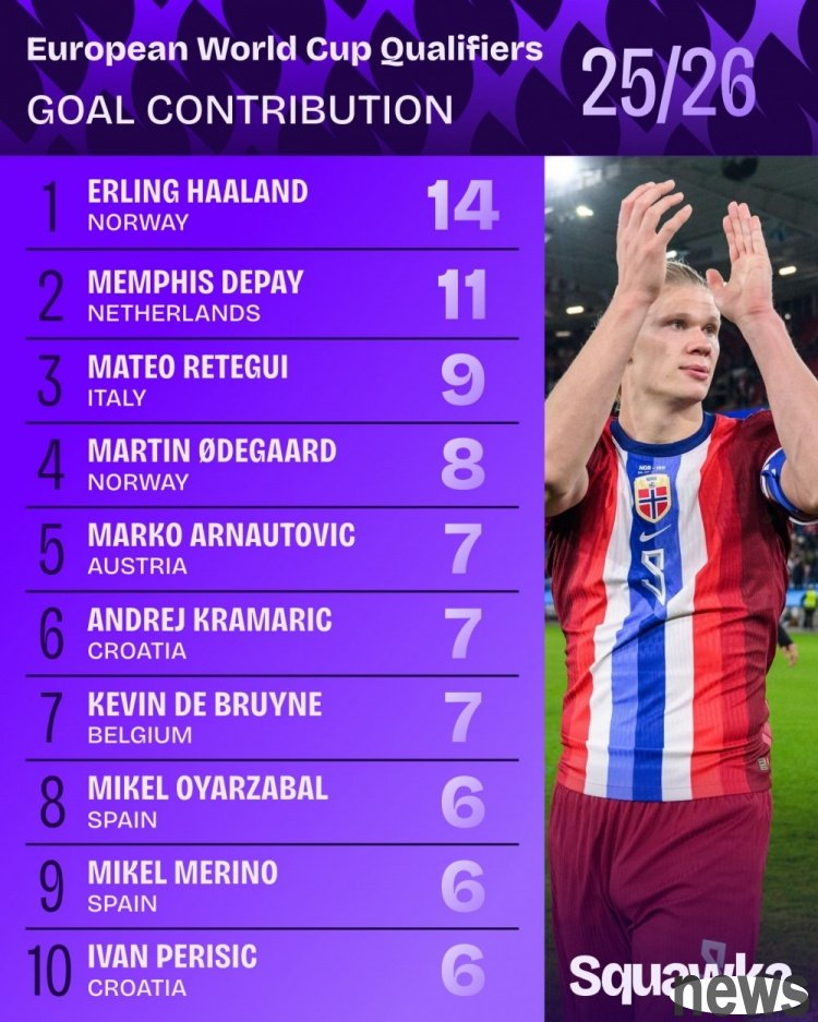 Squawka counted the number of goals (assists + goals) participated by players in this European World Cup preliminaries and listed the list. Haaland ranked first with 14 goals, followed by Depay with 11 goals.