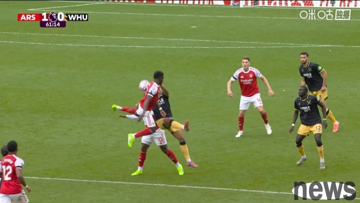 Premier League 7th round, Arsenal vs. West Ham United. In the 60th minute of the game, Saka was hit on the face by his opponent and some blood came out of his nose.