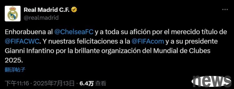 After Chelsea defeated Paris 3-0 to win the Club World Cup, Real Madrid immediately expressed their congratulations through social media.